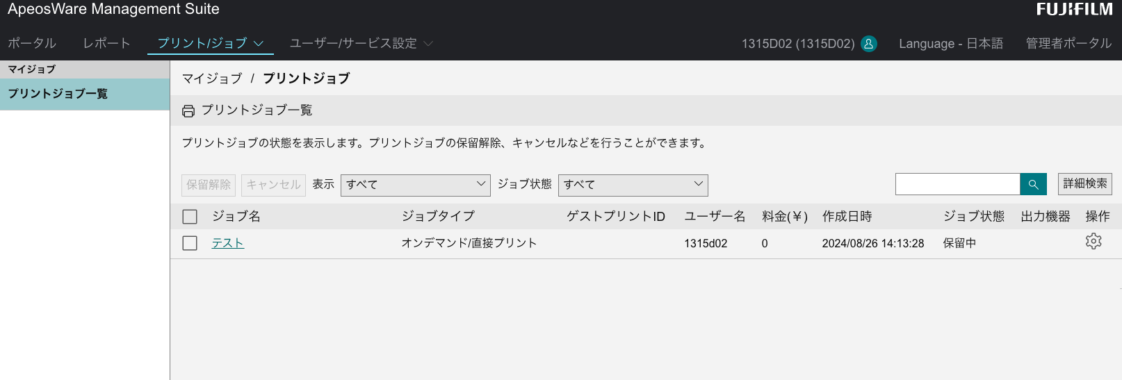 - プリントジョブ一覧・・・ログインしたユーザID=パソコンから30分以内にプリント送信したジョブのみが表示されます。